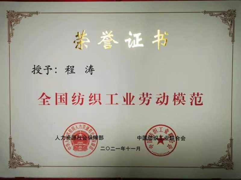 程涛荣获“全国纺织工业劳动模范“称号